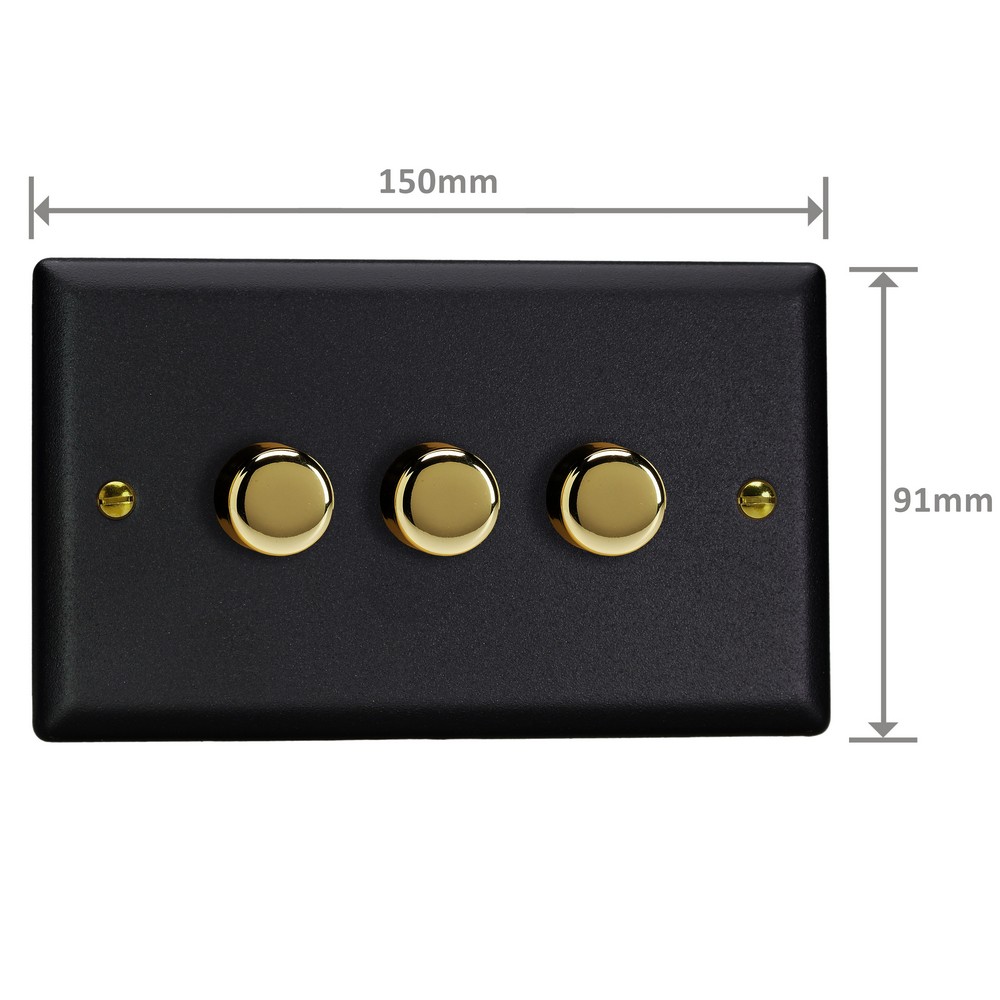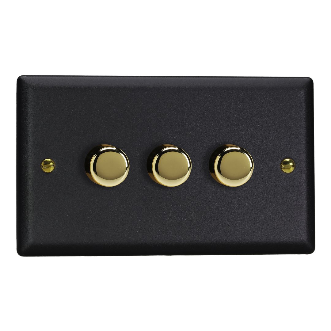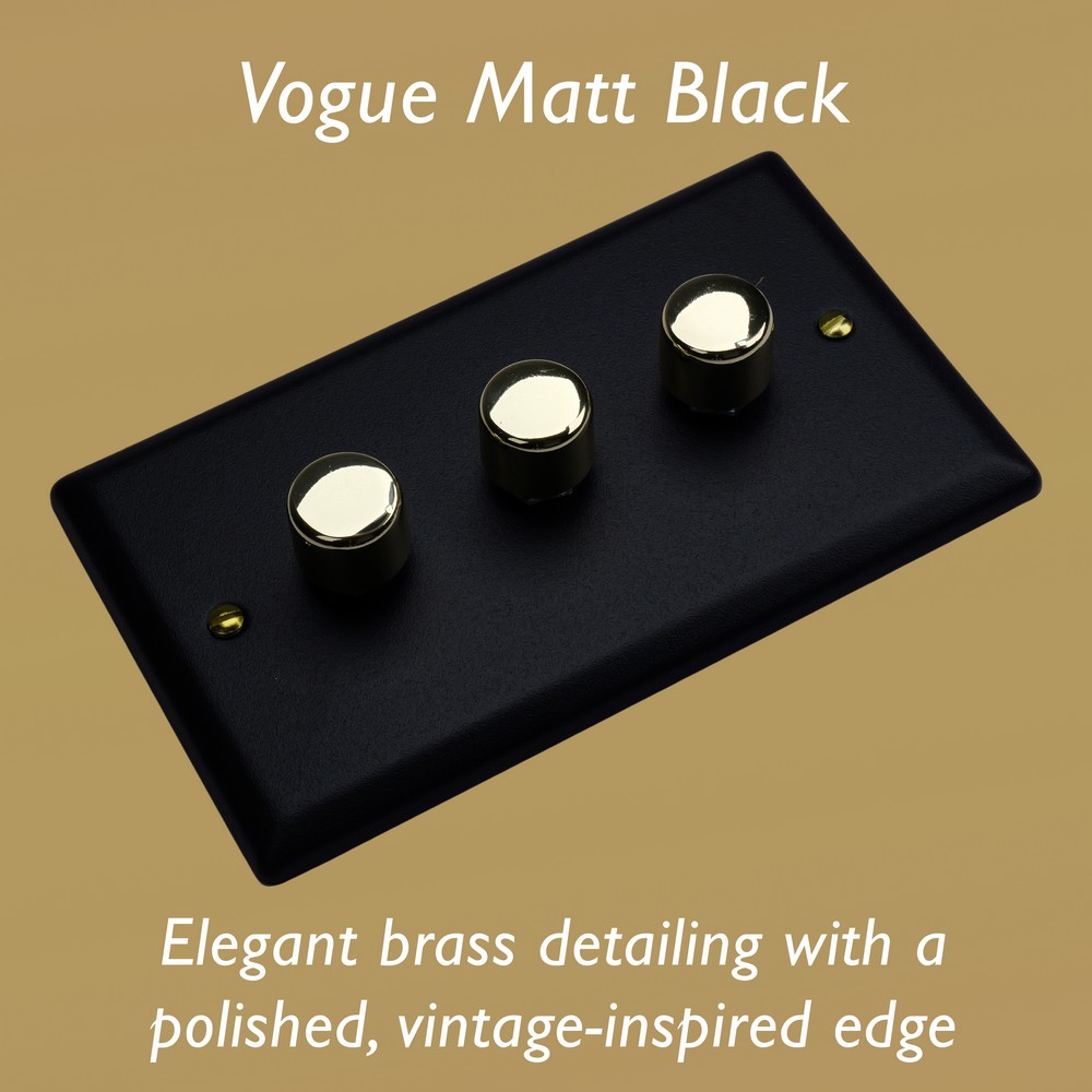 The Matt Black finish is powder-coated to give a tactile, textured finish, which is tough, durable and resistant to fingerprints and is elevated here with the signature brass detailing of the Vogue Collection. Varilight Decorative wiring accessories are British made and covered by the Varilight lifetime guarantee.