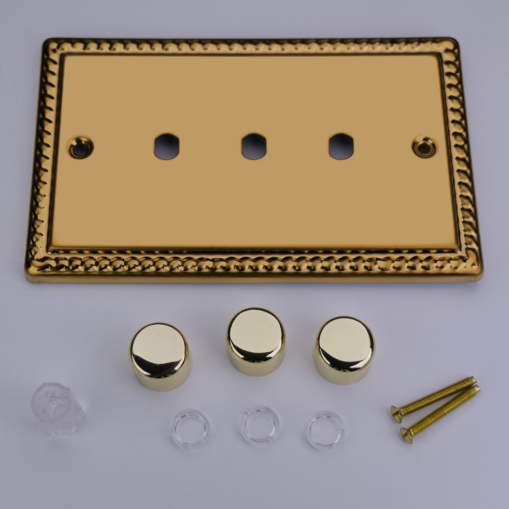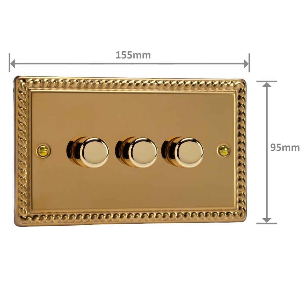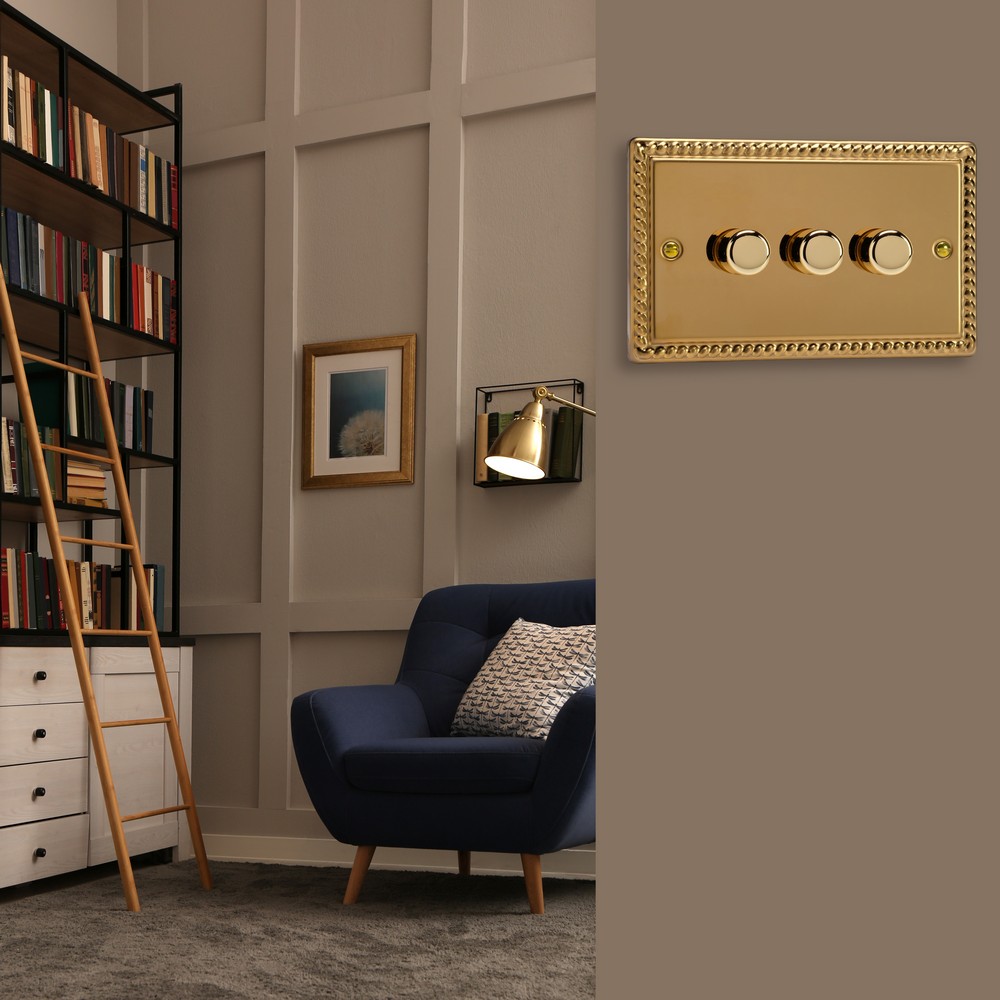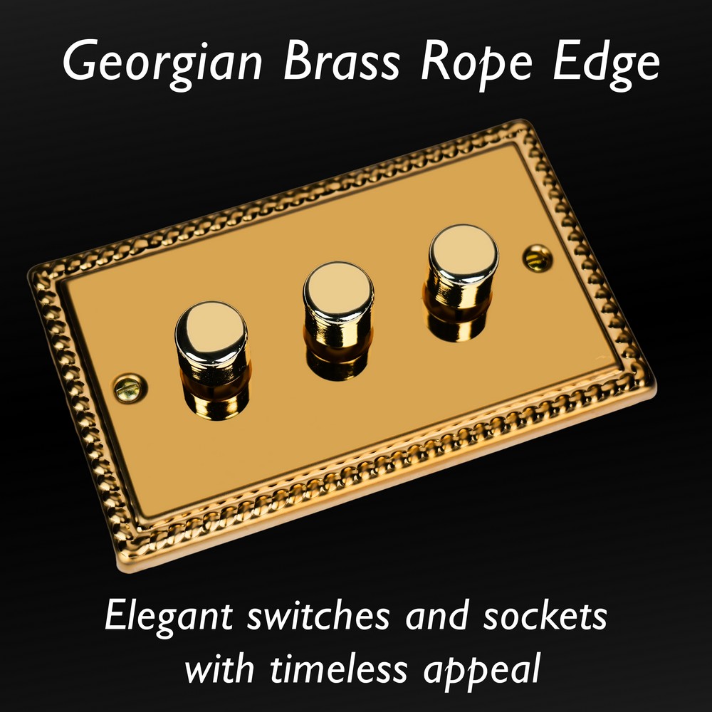 Polished Brass remains one of the most versatile finishes and is paired here with Georgian rope edged faceplates for an enduringly classical appeal. Varilight Decorative wiring accessories are British made and covered by the Varilight lifetime guarantee.