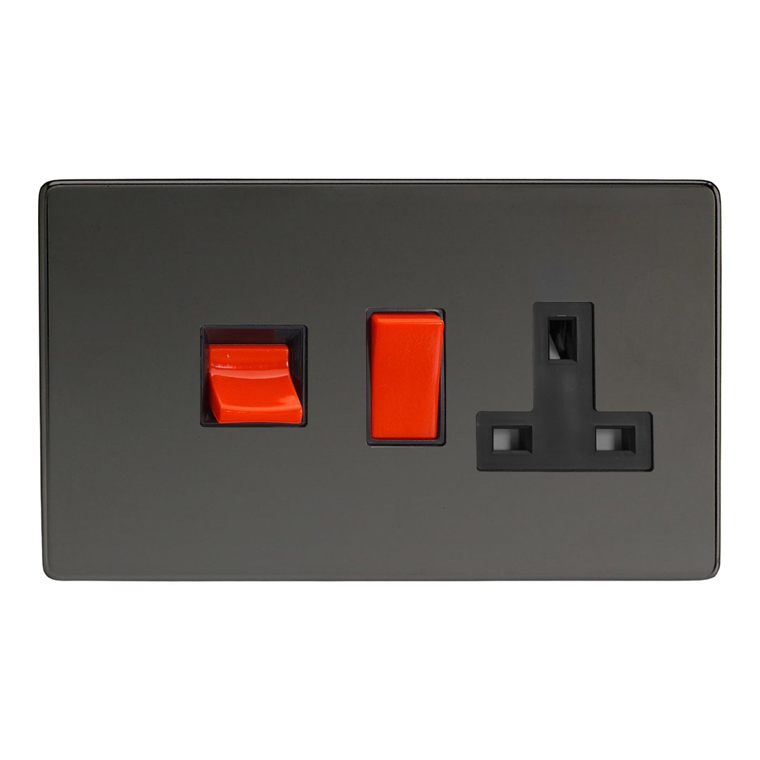 Product Description: 45A Cooker Panel with 13A Double Pole Switched Socket Outlet (Red Rocker)