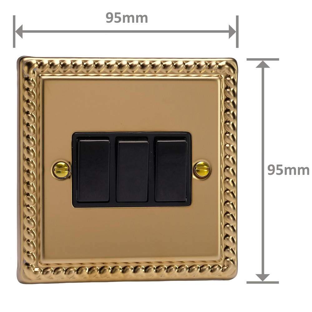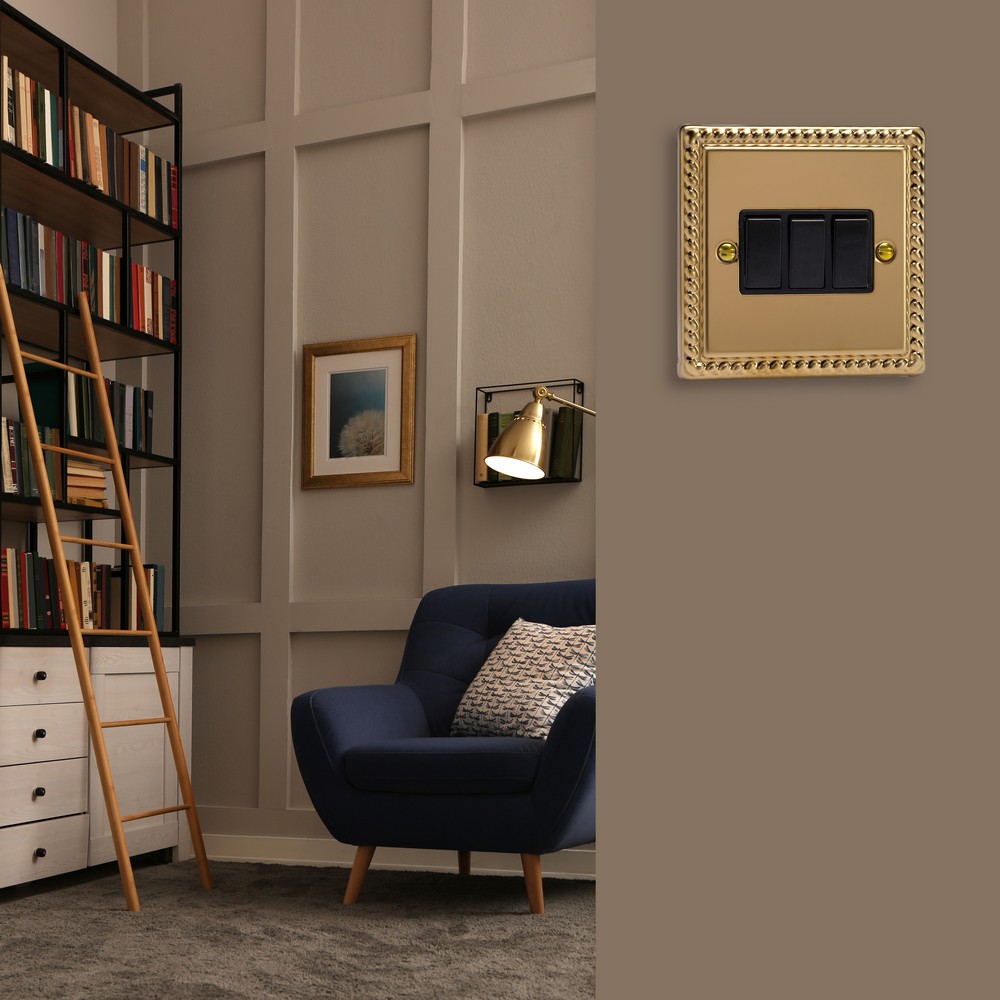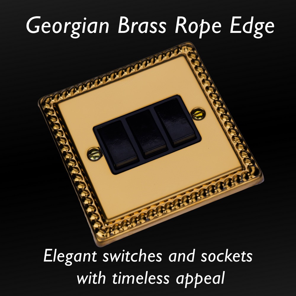Polished Brass remains one of the most versatile finishes and is paired here with Georgian rope edged faceplates for an enduringly classical appeal. Varilight Decorative wiring accessories are British made and covered by the Varilight lifetime guarantee.