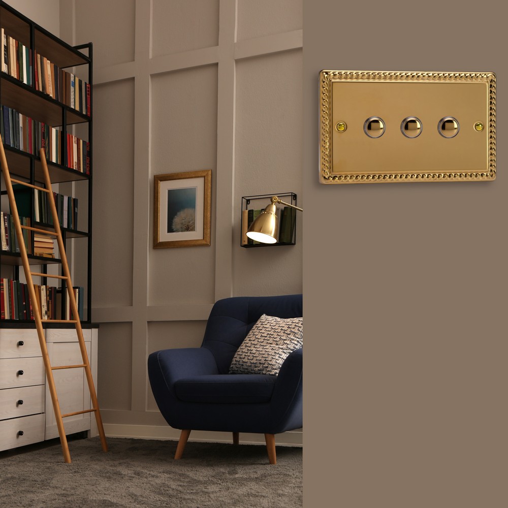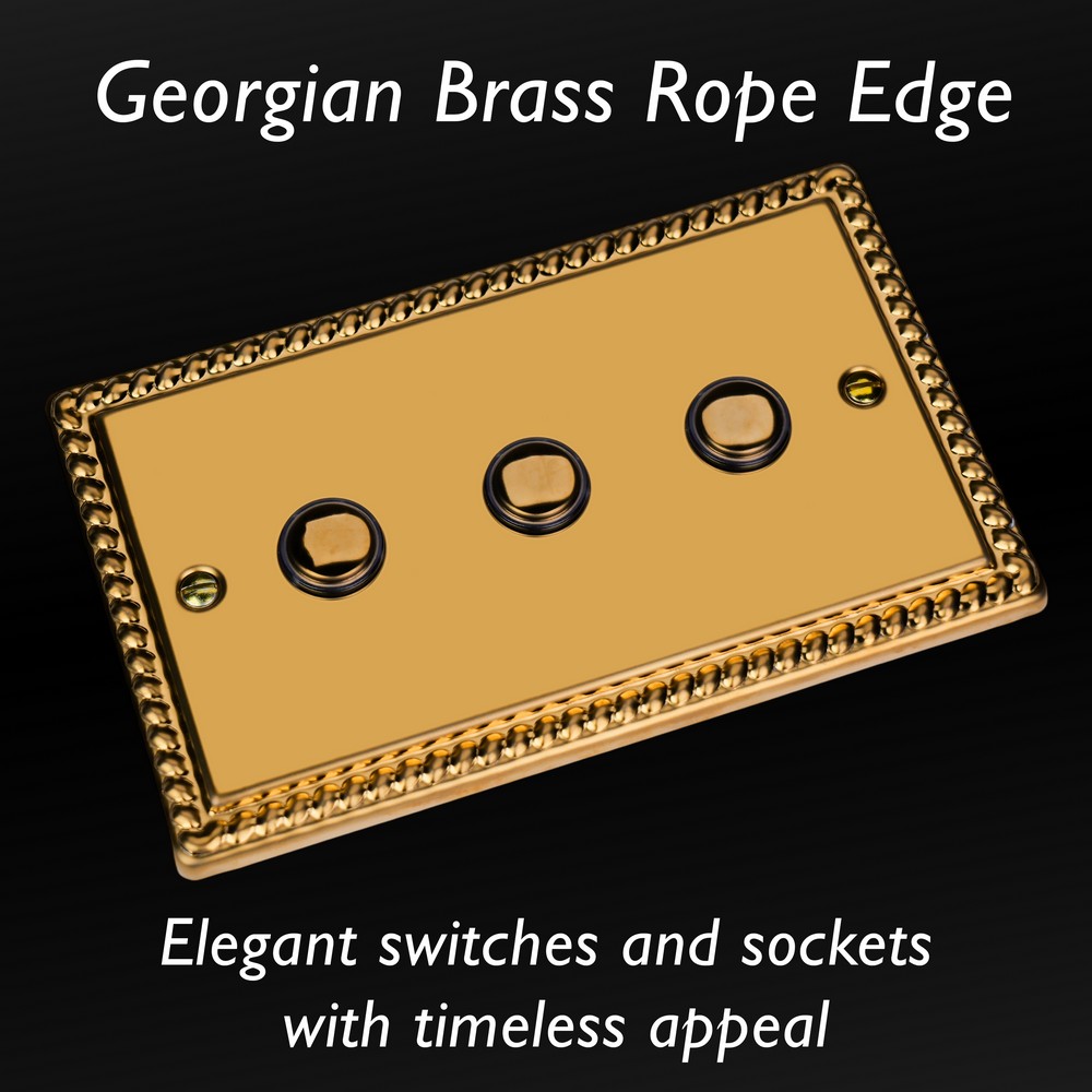 Polished Brass remains one of the most versatile finishes and is paired here with Georgian rope edged faceplates for an enduringly classical appeal. Varilight Decorative wiring accessories are British made and covered by the Varilight lifetime guarantee.
