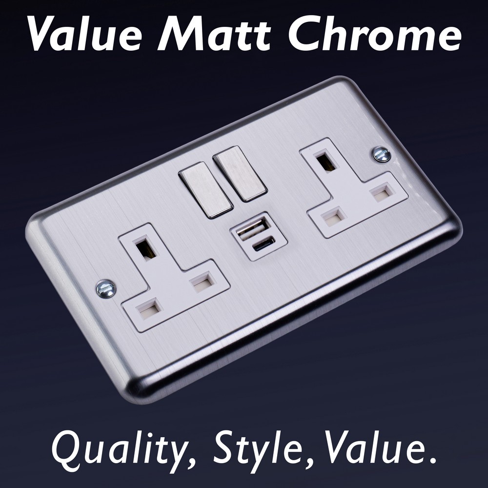 Matt Chrome offers unbeatable value for those seeking a beautiful Decorative finish at a great price point. Choose between black, white or matching metal rockers. Varilight Decorative wiring accessories are British made and covered by the Varilight lifetime guarantee.