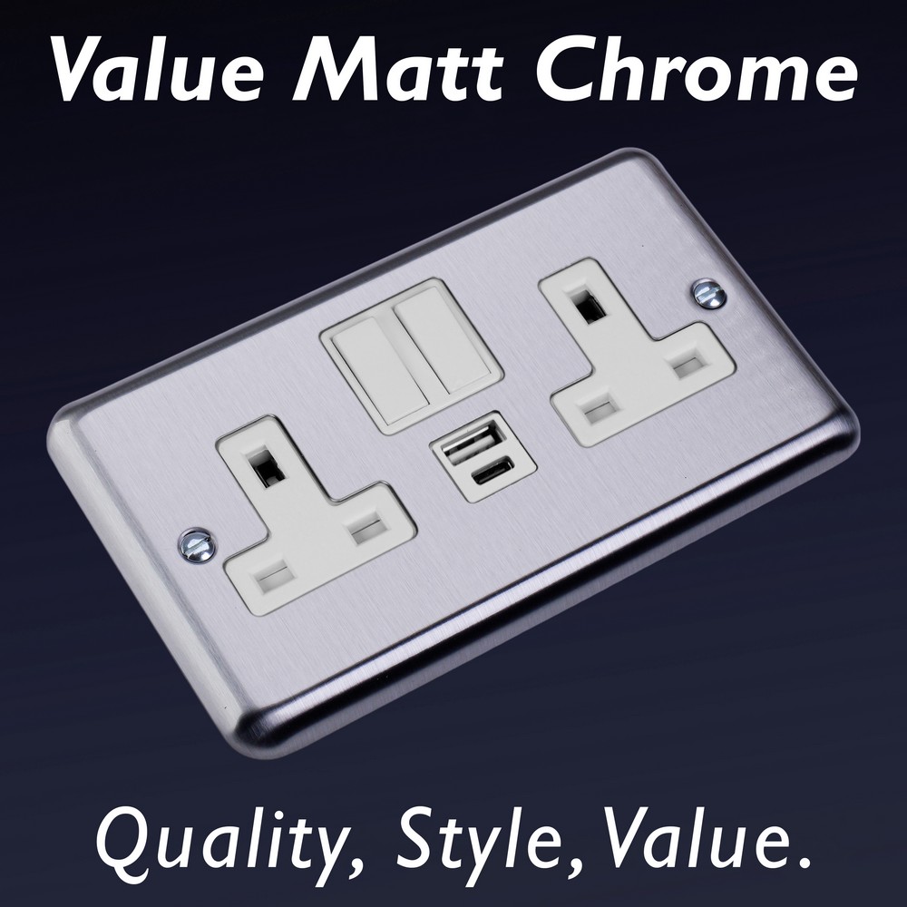 Matt Chrome offers unbeatable value for those seeking a beautiful Decorative finish at a great price point. Choose between black, white or matching metal rockers. Varilight Decorative wiring accessories are British made and covered by the Varilight lifetime guarantee.