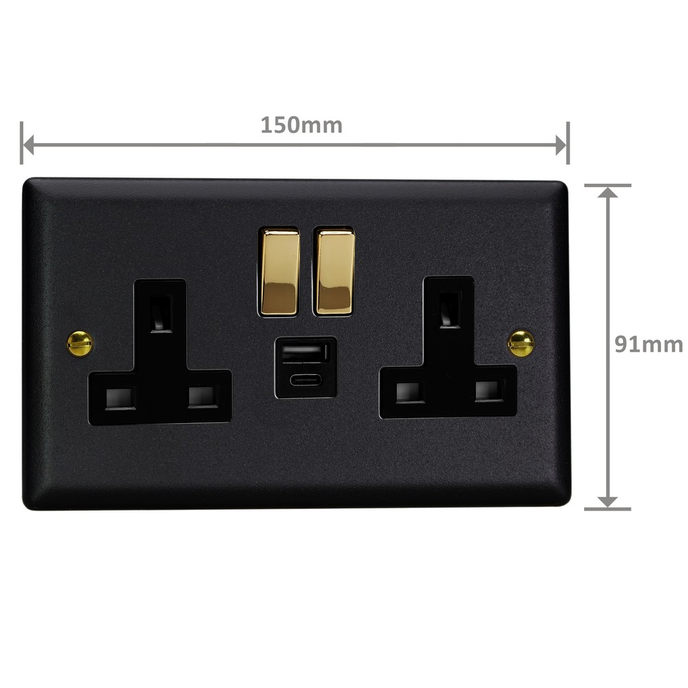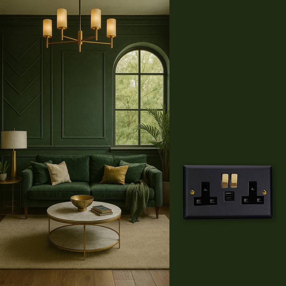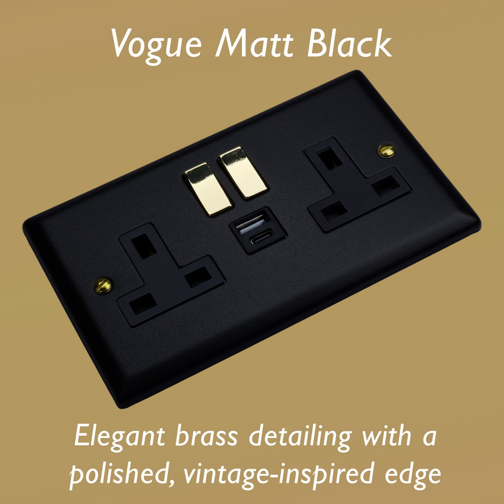 The Matt Black finish is powder-coated to give a tactile, textured finish, which is tough, durable and resistant to fingerprints and is elevated here with the signature brass detailing of the Vogue Collection. Varilight Decorative wiring accessories are British made and covered by the Varilight lifetime guarantee.