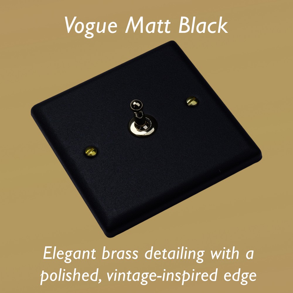 The Matt Black finish is powder-coated to give a tactile, textured finish, which is tough, durable and resistant to fingerprints and is elevated here with the signature brass detailing of the Vogue Collection. Varilight Decorative wiring accessories are British made and covered by the Varilight lifetime guarantee.