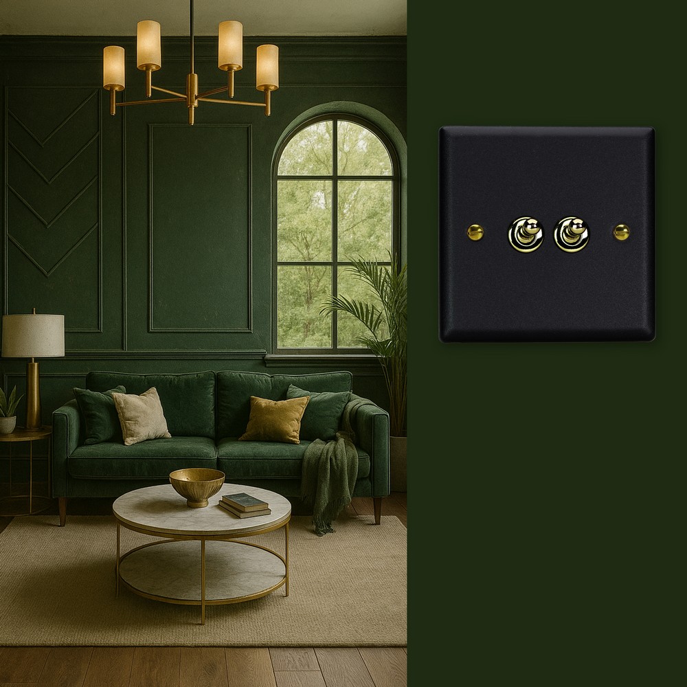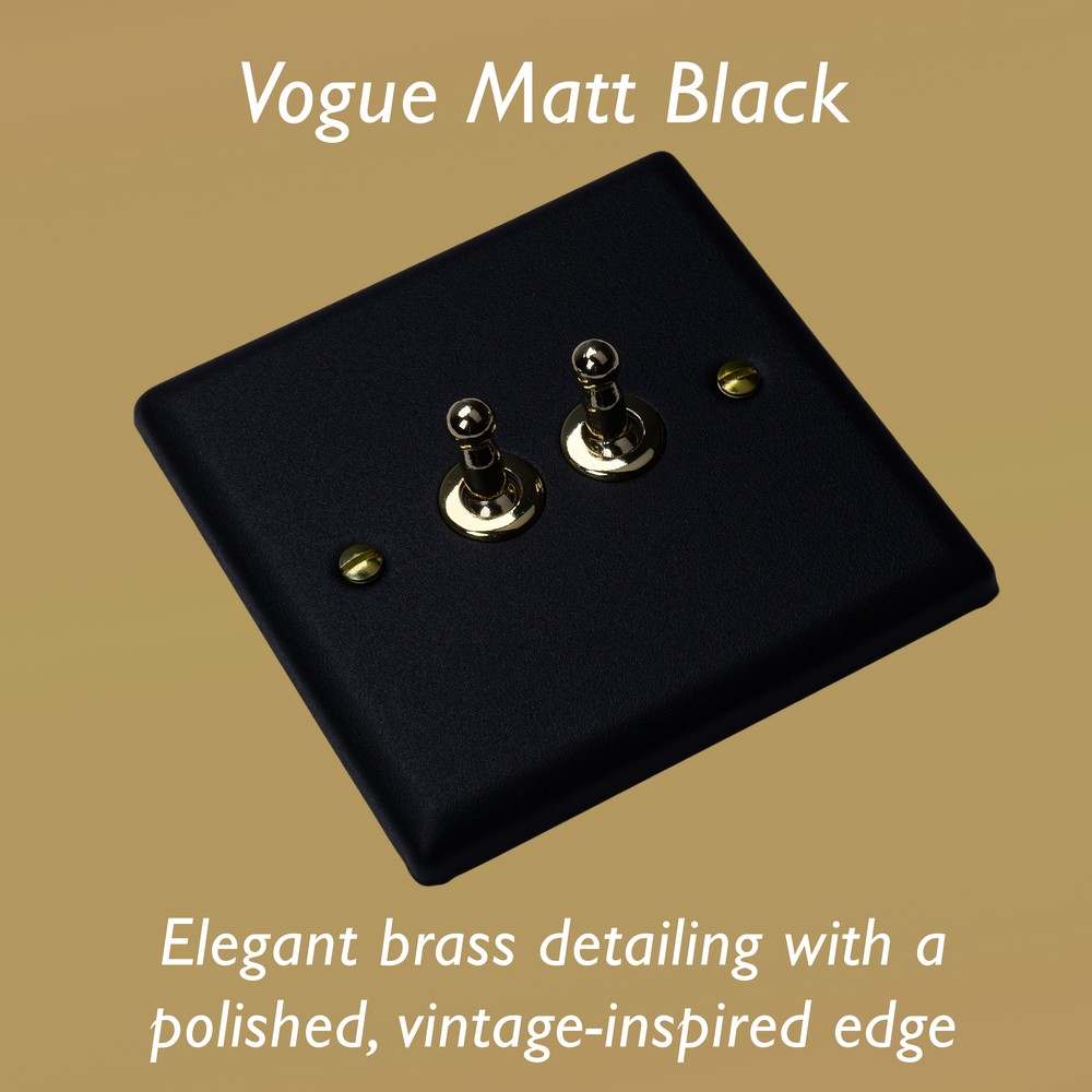 The Matt Black finish is powder-coated to give a tactile, textured finish, which is tough, durable and resistant to fingerprints and is elevated here with the signature brass detailing of the Vogue Collection. Varilight Decorative wiring accessories are British made and covered by the Varilight lifetime guarantee.