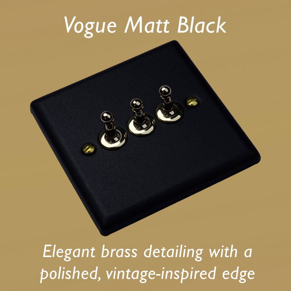 The Matt Black finish is powder-coated to give a tactile, textured finish, which is tough, durable and resistant to fingerprints and is elevated here with the signature brass detailing of the Vogue Collection. Varilight Decorative wiring accessories are British made and covered by the Varilight lifetime guarantee.