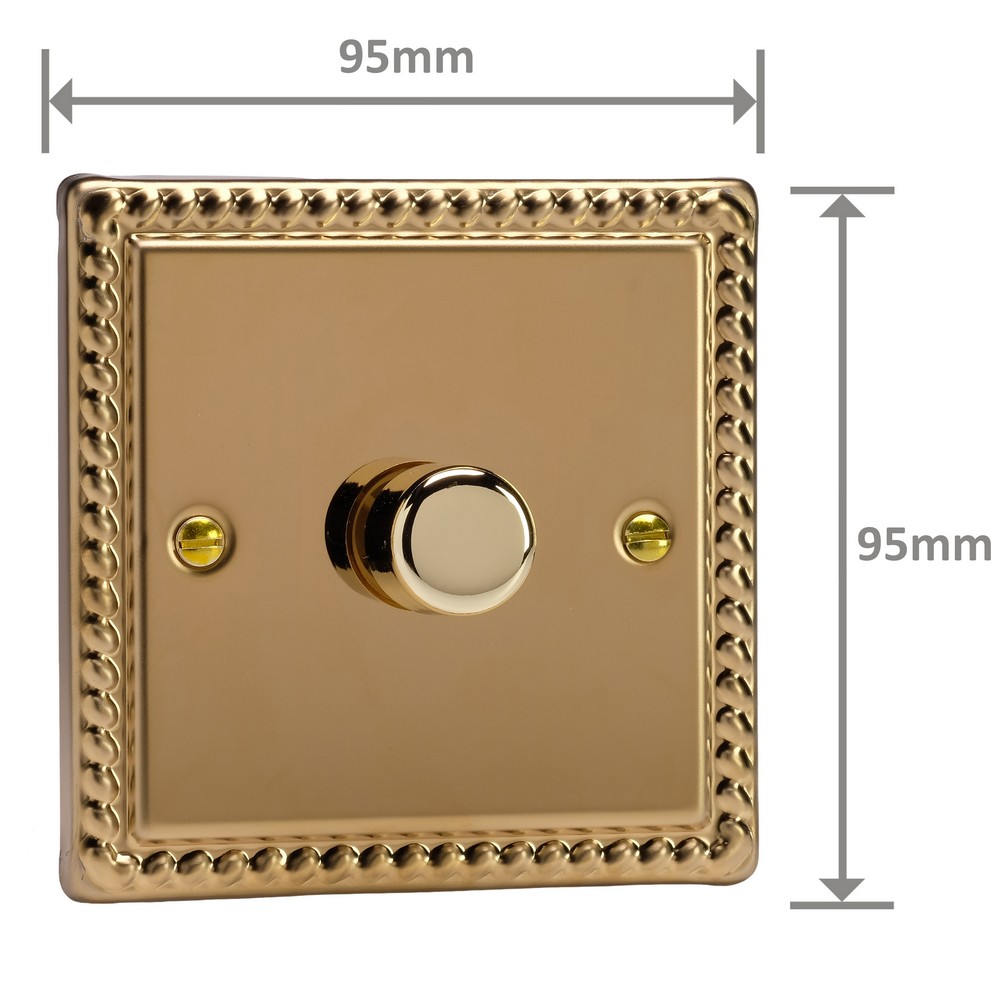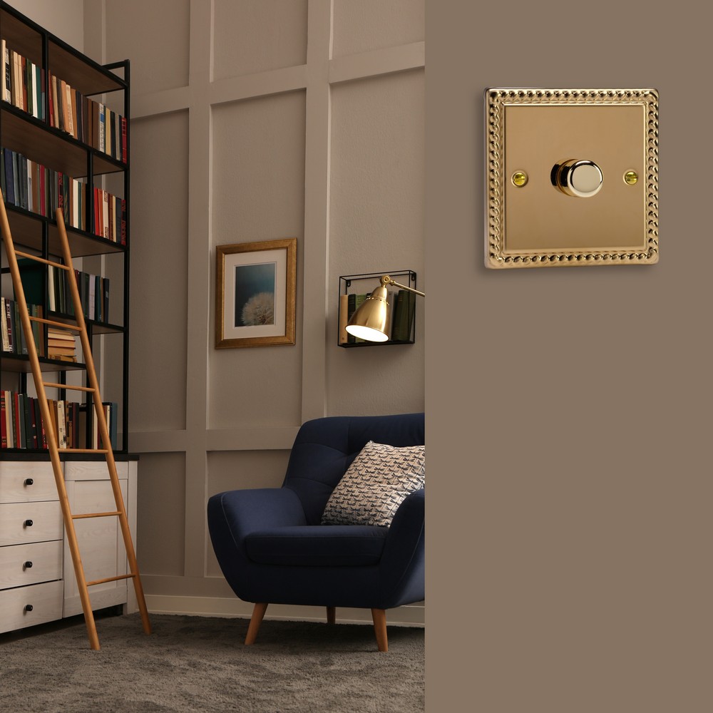 Polished Brass remains one of the most versatile finishes and is paired here with Georgian rope edged faceplates for an enduringly classical appeal. Varilight Decorative wiring accessories are British made and covered by the Varilight lifetime guarantee.