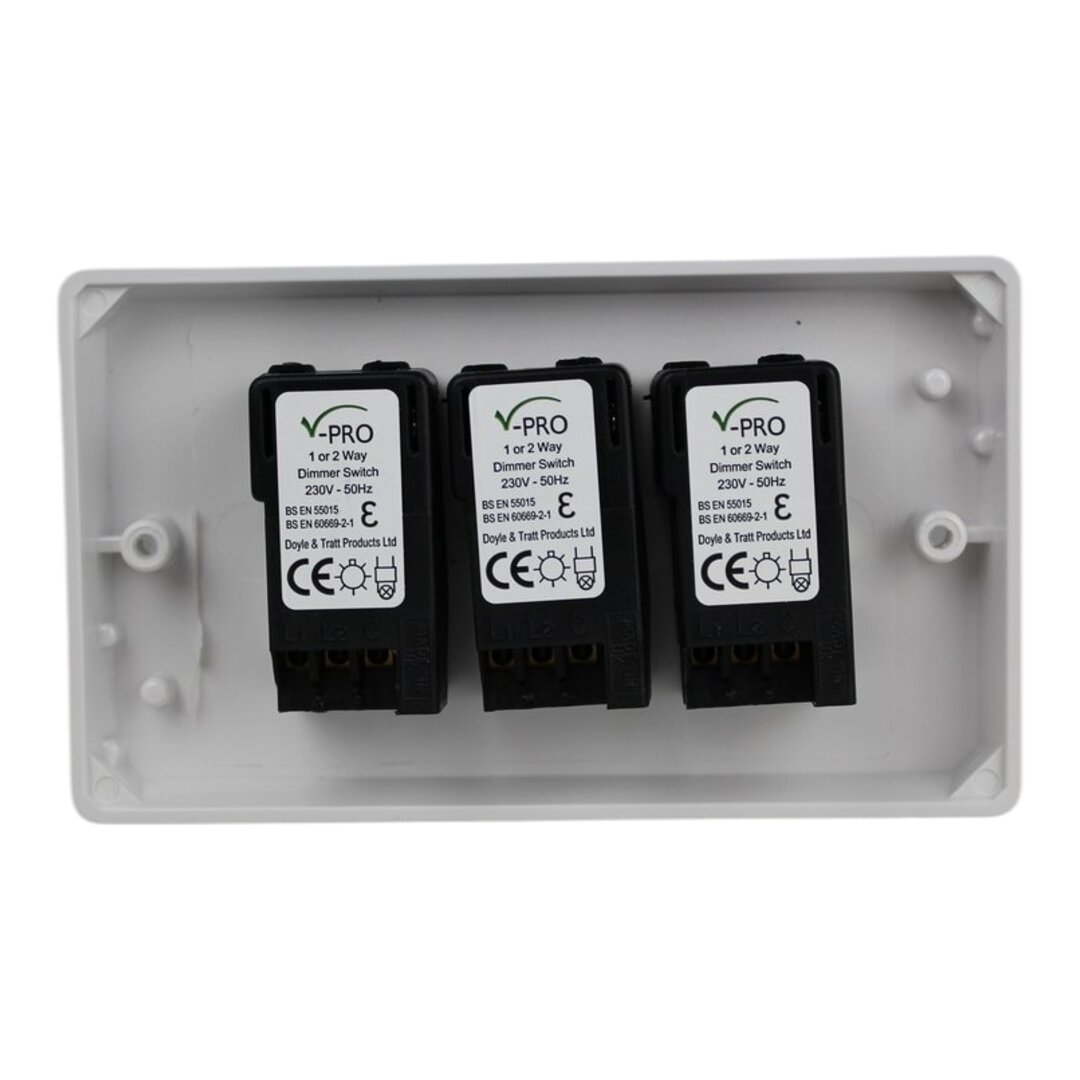 Product Description: 3-Gang 2-Way V-Pro Push On/Off Rotary LED Dimmer 3 x 0-120W (Twin Plate)