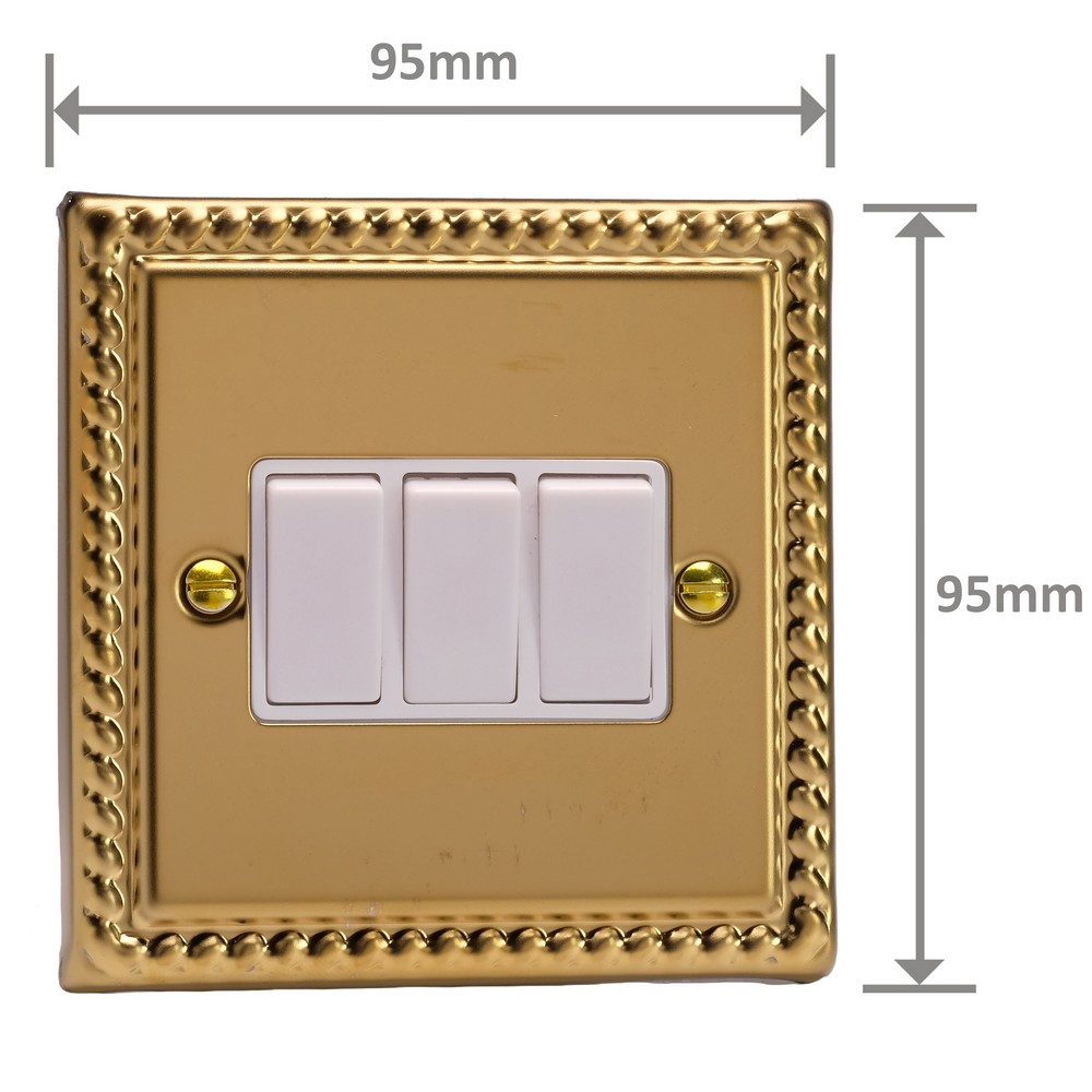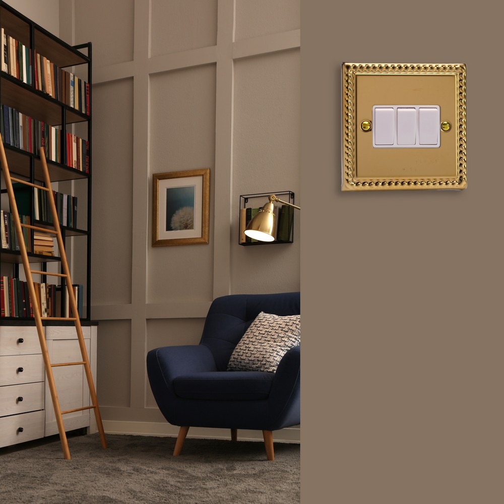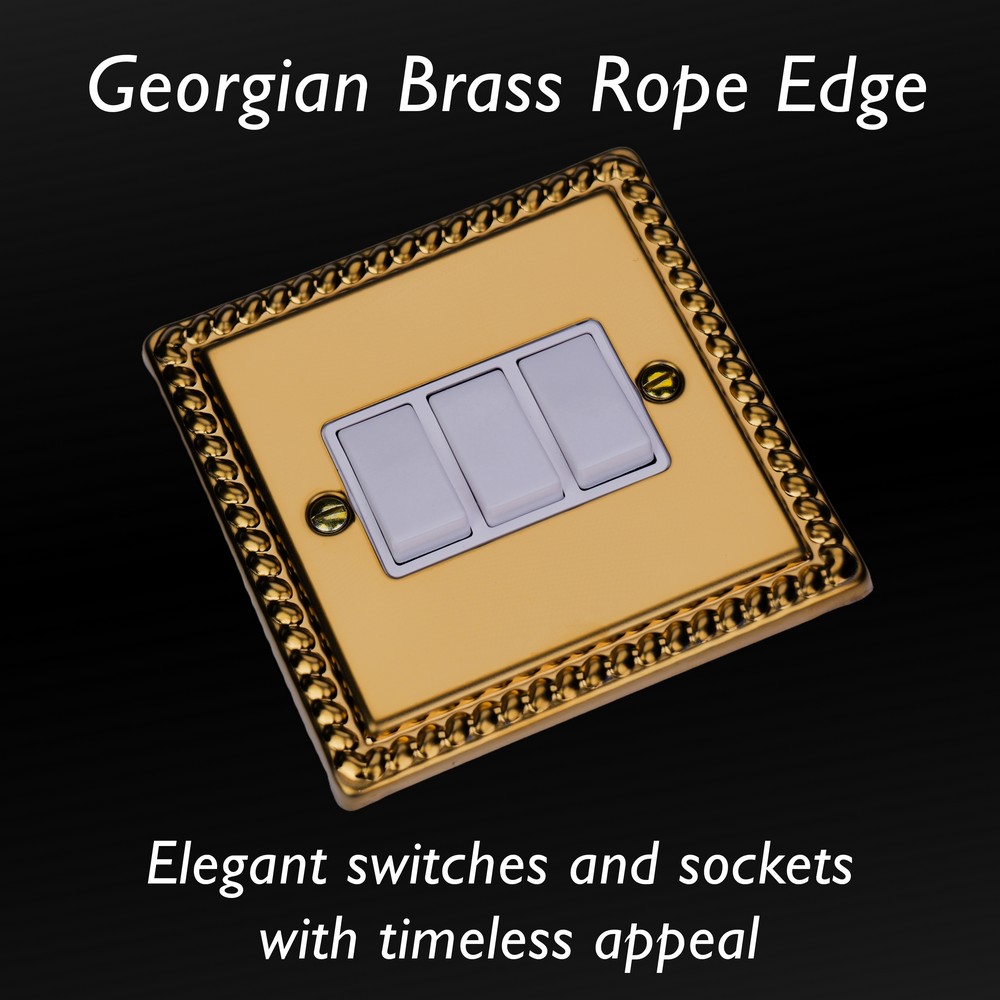 Polished Brass remains one of the most versatile finishes and is paired here with Georgian rope edged faceplates for an enduringly classical appeal. Varilight Decorative wiring accessories are British made and covered by the Varilight lifetime guarantee.