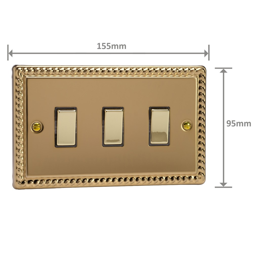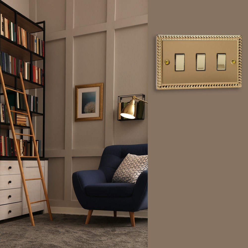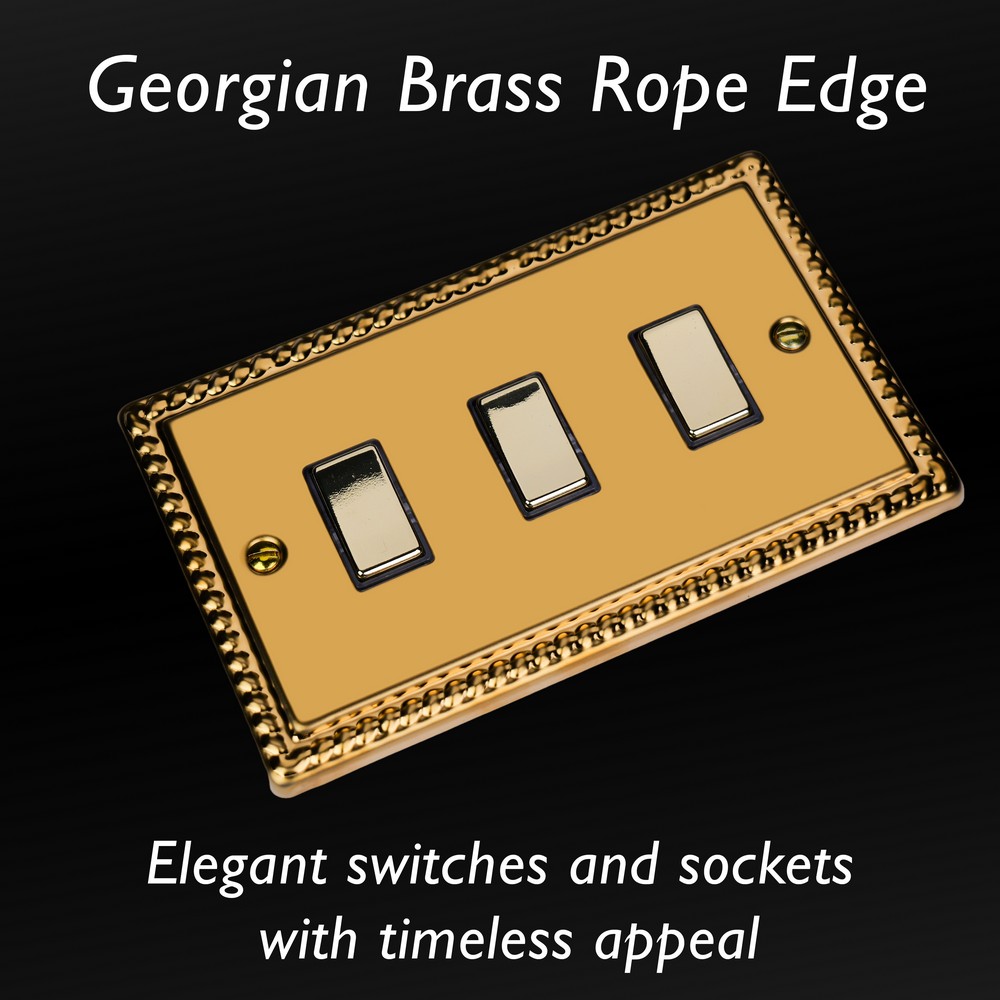 Polished Brass remains one of the most versatile finishes and is paired here with Georgian rope edged faceplates for an enduringly classical appeal. Varilight Decorative wiring accessories are British made and covered by the Varilight lifetime guarantee.