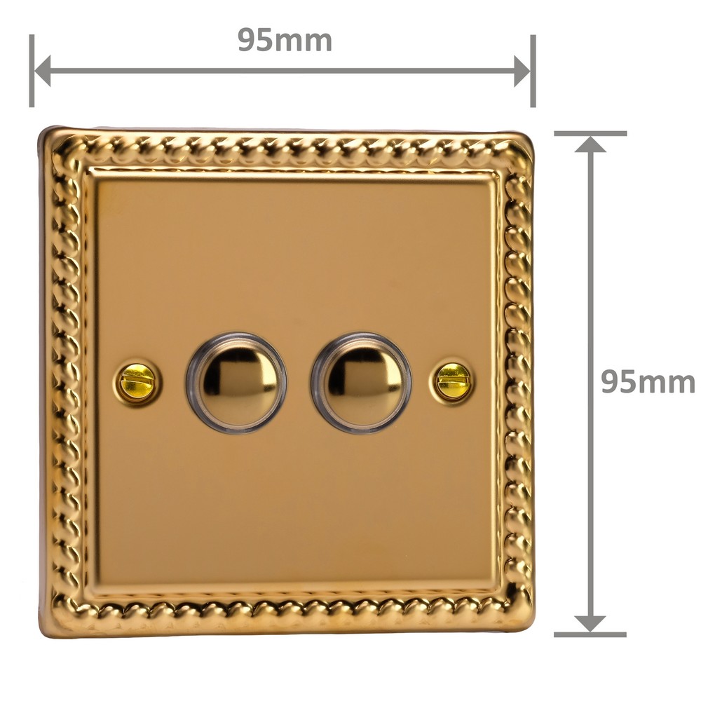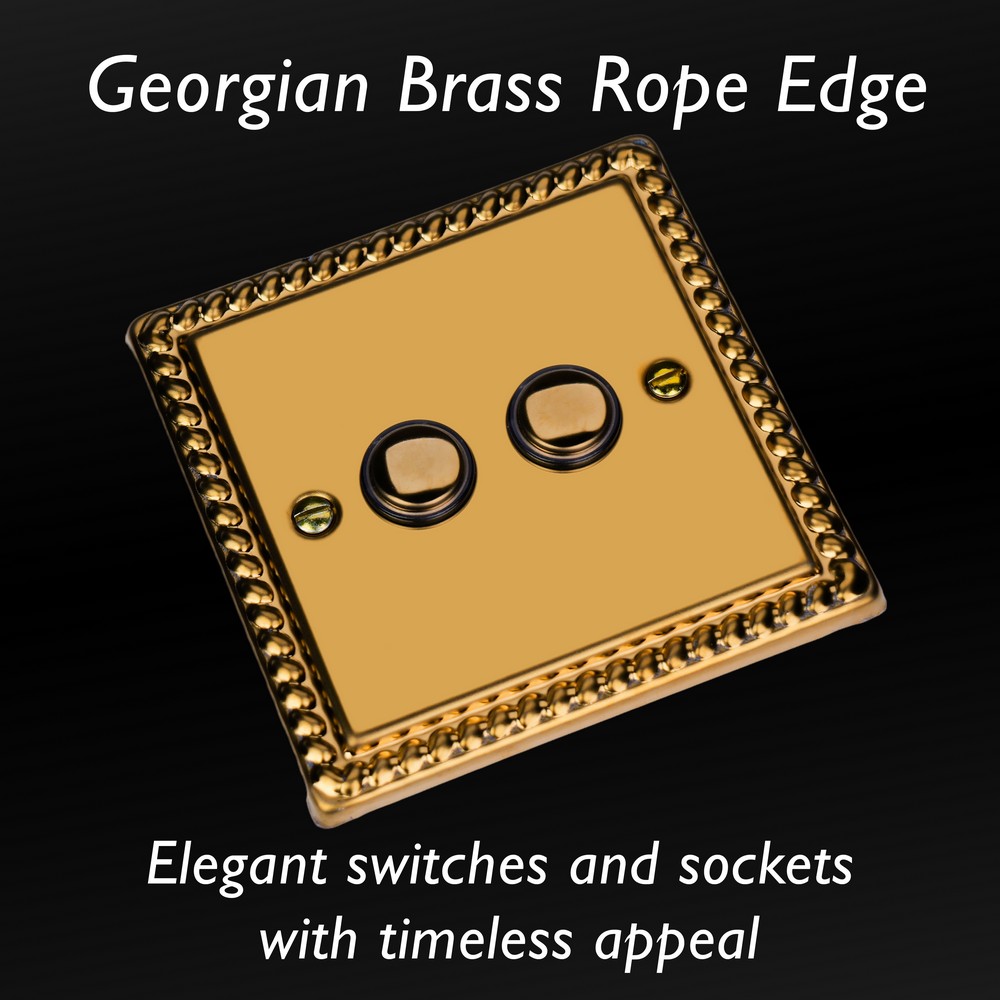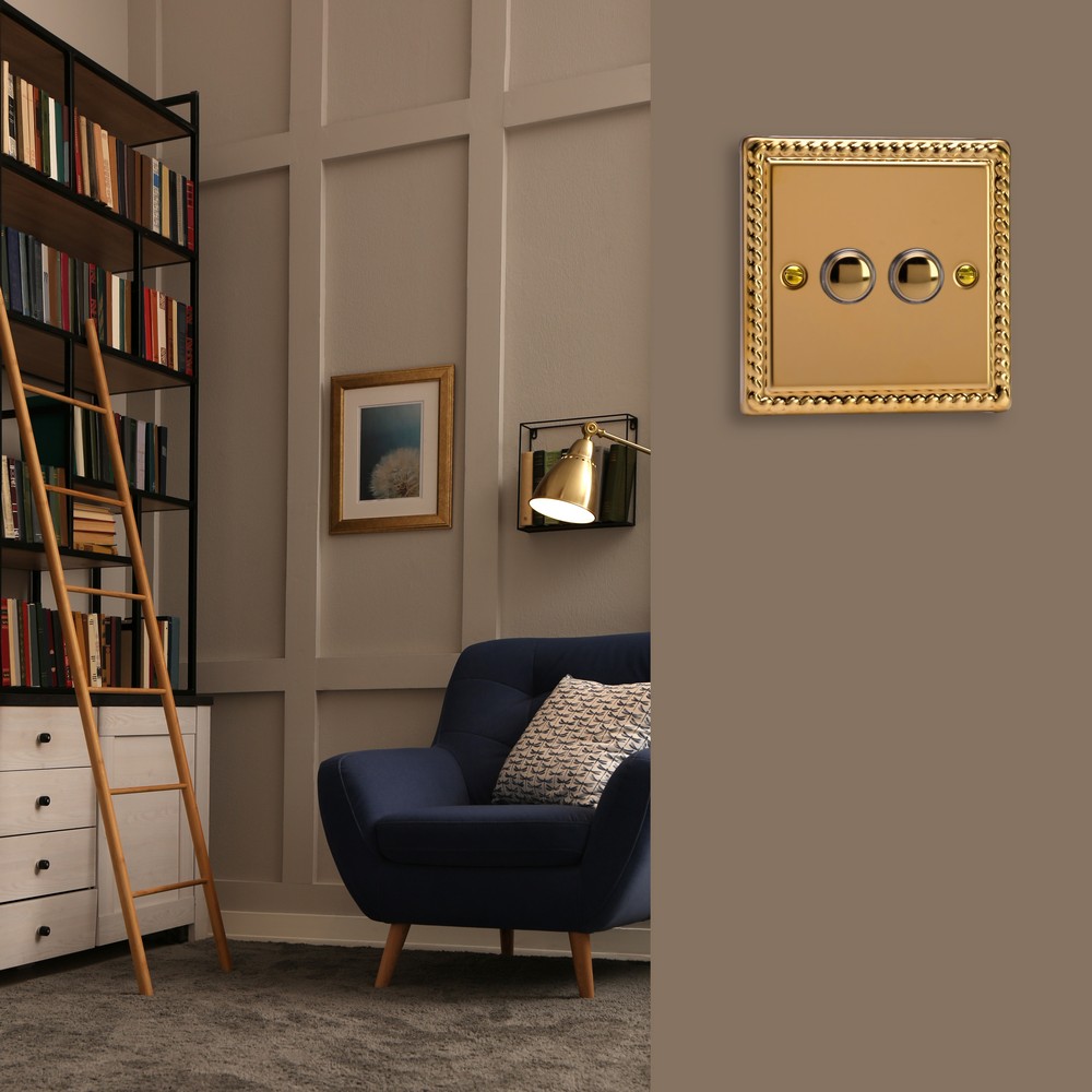 Polished Brass remains one of the most versatile finishes and is paired here with Georgian rope edged faceplates for an enduringly classical appeal. Varilight Decorative wiring accessories are British made and covered by the Varilight lifetime guarantee.